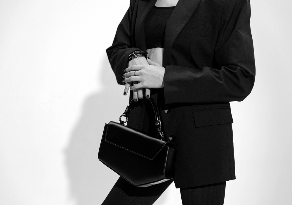 Блейзер может также стать основным элементом вечернего образа: застегните его на пуговицы и наденьте колготки с актуальным принтом (надписи или геометрический узор), дополните образ элегантными лодочками или грубыми ботинками и маленькой кожаной сумочкой, как в нашей съемке.